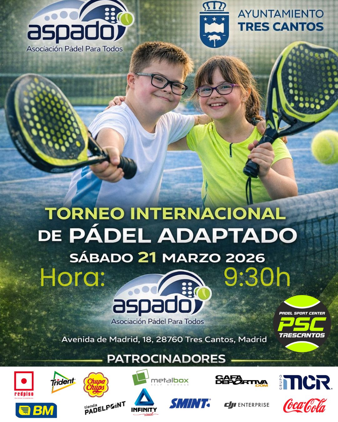 El Club de Pádel Sport Center en Tres Cantos, Madrid, será el escenario de nuestro Torneo de Pádel Adaptado. Este evento no solo es una competencia, sino un encuentro para familias, entrenadores y entidades comprometidas con la inclusión. Ven y sé parte de un día que celebra la diversidad y el poder transformador del deporte.